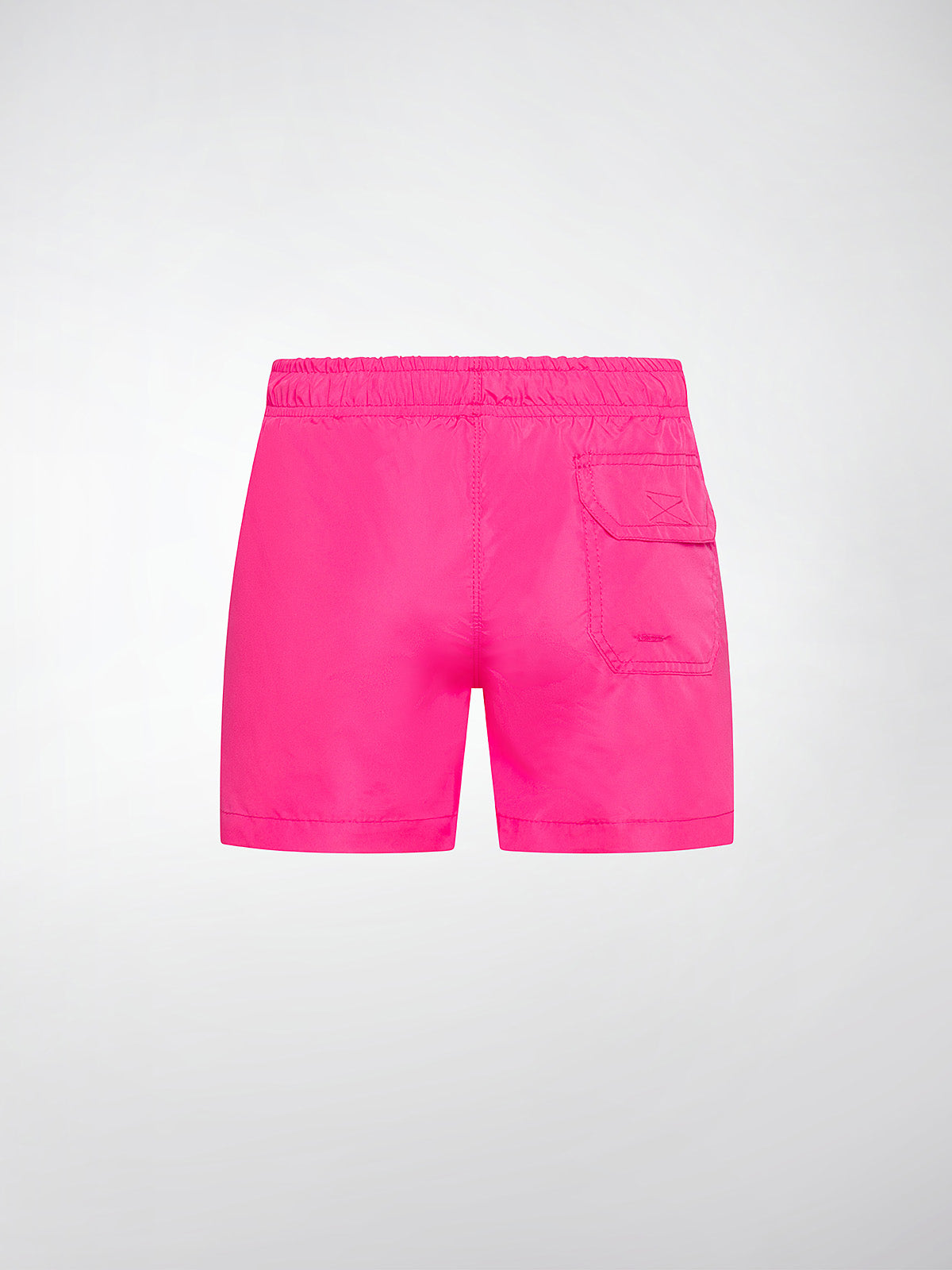 Costume boxer con elastico in vita e coulisse. Ottimo comfort offerto dalle tasche laterali a filetto e dalla tasca posteriore con chiusura a velcro. Tessuto a rapida asciugatura. Un outfit coordinato figlio e papà.