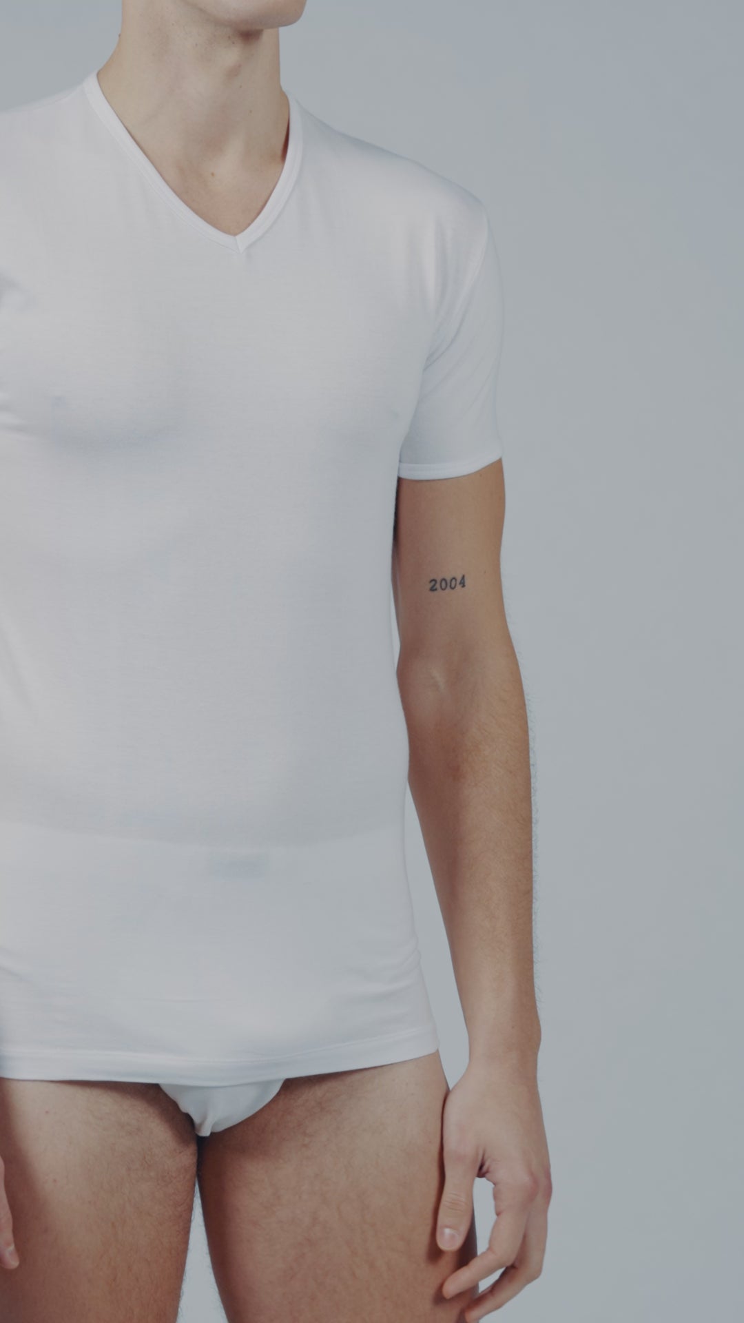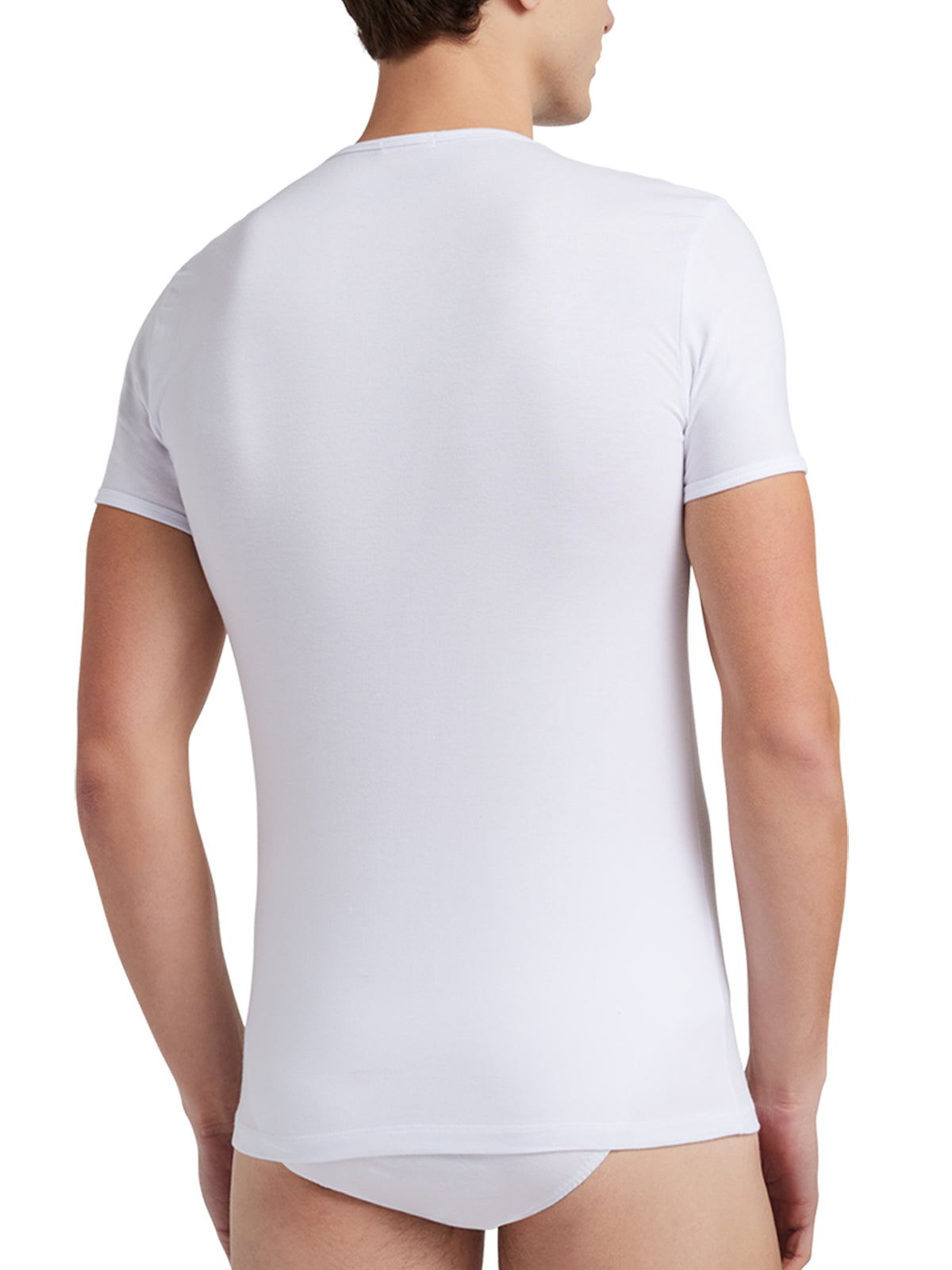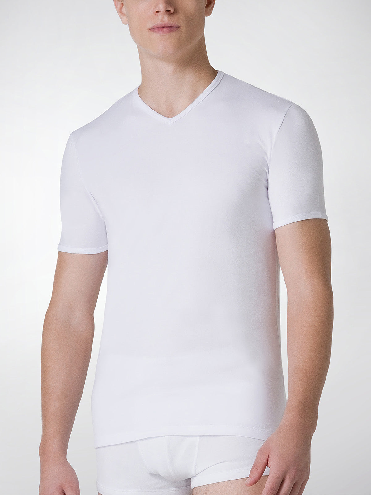 T-Shirt con scollo a V realizzata in cotone elasticizzato e con una vestibilità ideale da indossare in qualsiasi occasione.